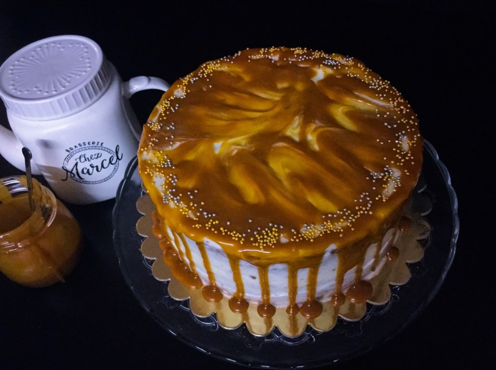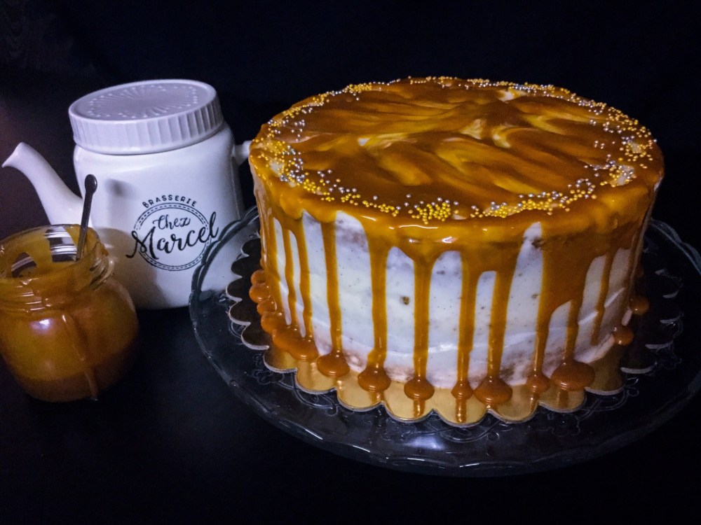 Nel comporre il dolce, tra un disco di torta e l’altro ho messo sia un abbondante strato di creamcheese che qualche cucchiaiata di salsa al caramello. Ho rifinito esternamente con altro frosting e con una colata di salsa al caramello e decorato con qualche perlina di mompariglia oro e argento.