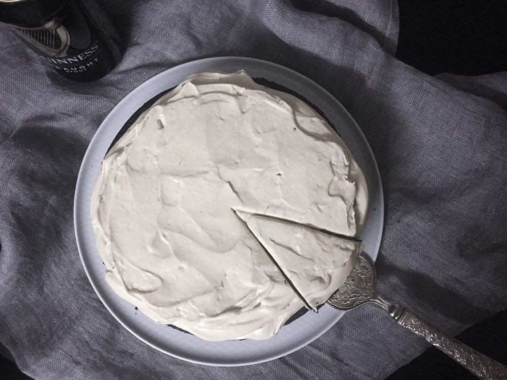 Quando la torta sarà del tutto fredda, adagiamola su un piatto da portata e glassiamo la superficie con un abbondante strato di crema, quasi a ricordare la schiuma morbida e cremosa che tipicamente sovrasta un bel boccale di Guinness!!!