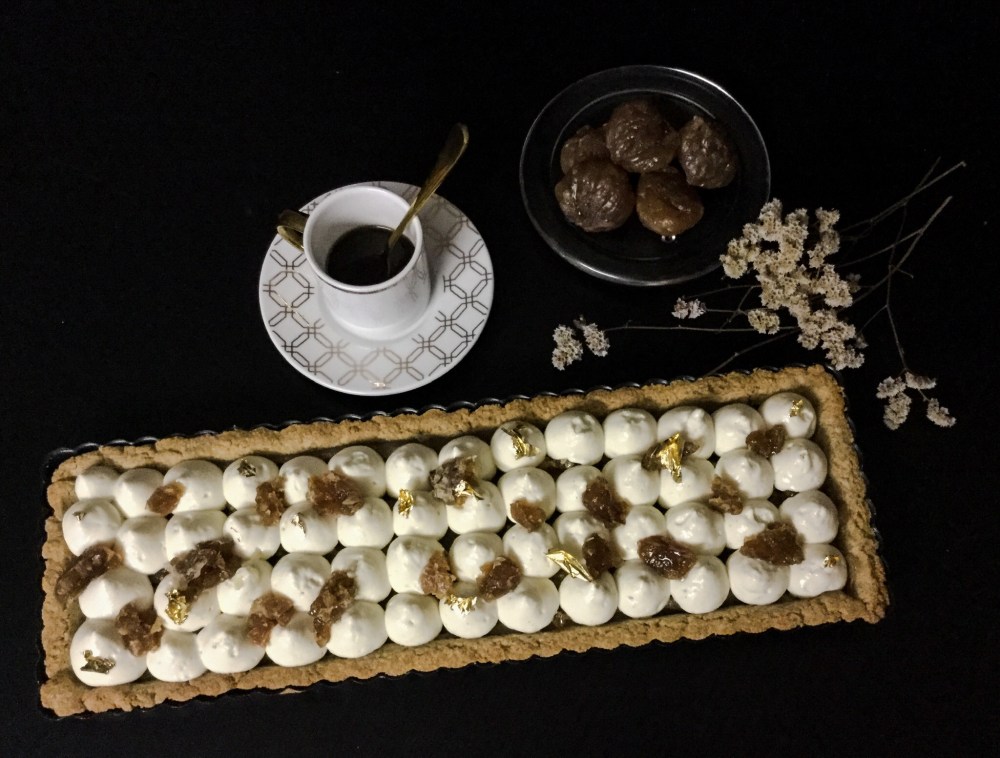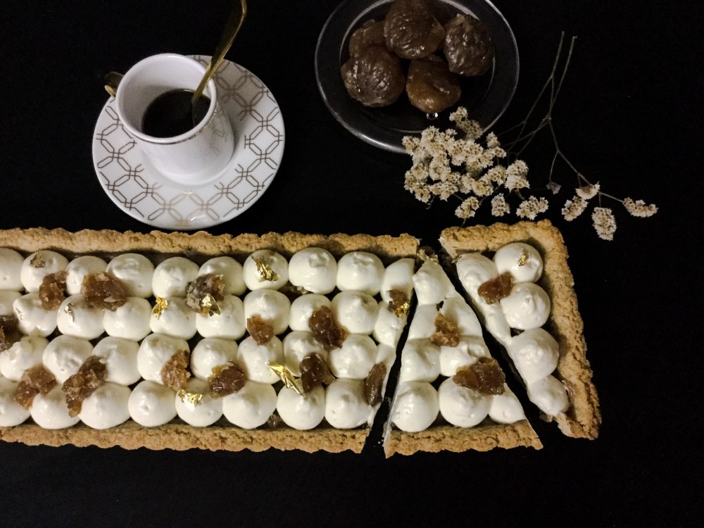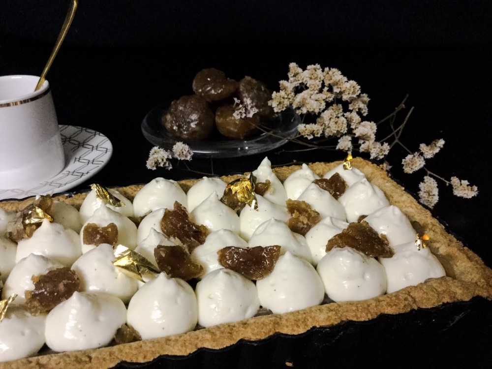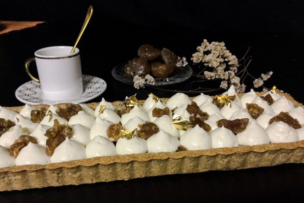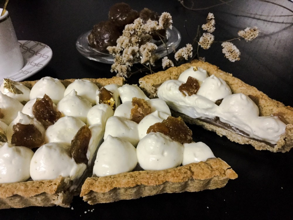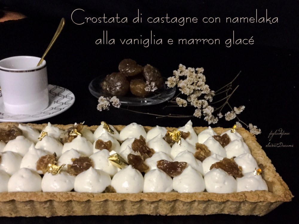 Per i miei gusti personali, in verità, un tantino troppo dolce: alla frolla di castagne ho accompagnato un sottile strato di crema di marroni, marron glacé a pezzetti, ciuffetti di namelaka alla vaniglia e decorato con altri marron glacé e foglie d’oro.